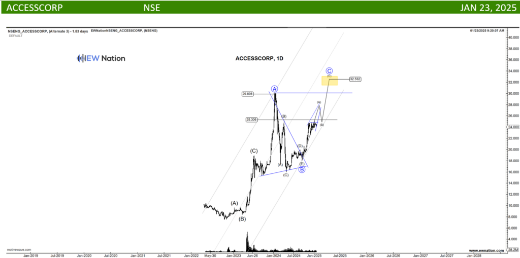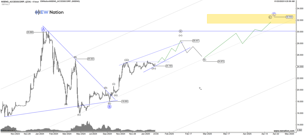 From the Elliot wave chart above, Accesscorp is making an ABC pattern having completed a triangle at the 18ngn mark. The subsequently move. however impulsive is a wave A of an impending ABC pattern which will complete the blue Wave C. The target for the completion of this wave is around the 32 region.