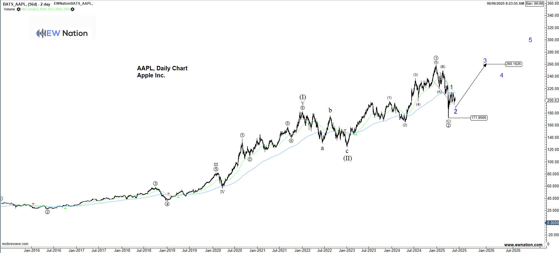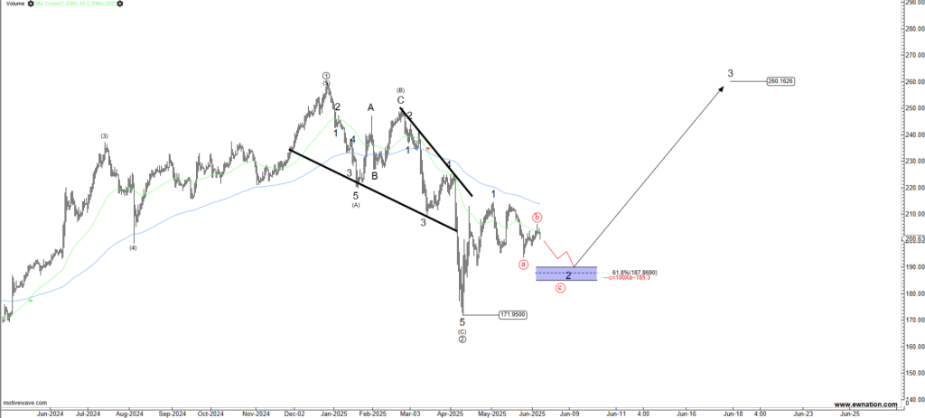 The chart above shows Apple’s progress since the bottom at $171.9 in April 2025. As visible, the stock rallied to $214 could already be seen as a complete five-wave impulse pattern.