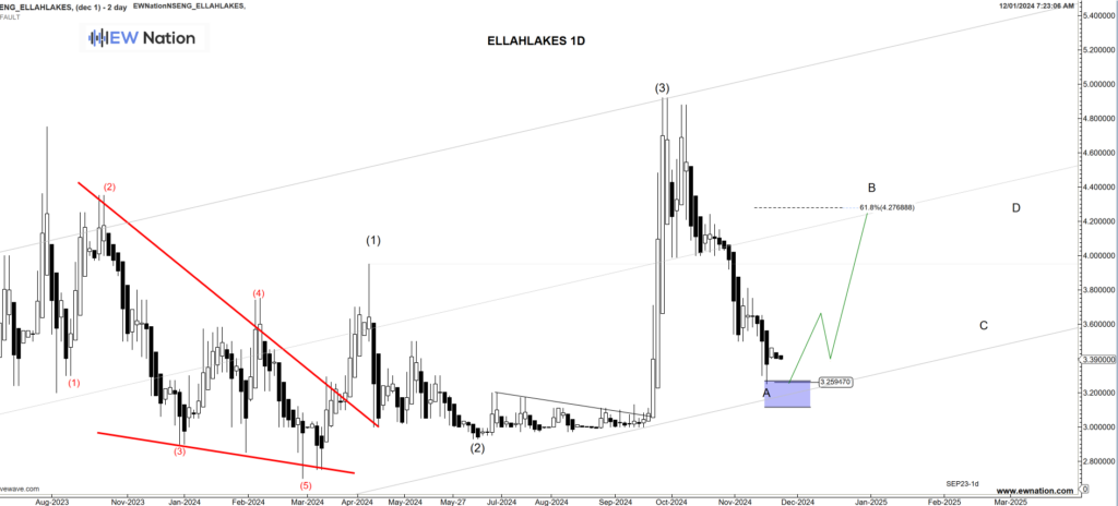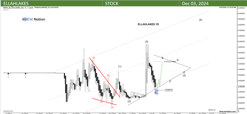 Ellahlakes completed Wave 3 at 4.93. The current sell off is a wave A of a triangle A-B-C-D-E. Target for wave A reversal is 3.1-3.25 region. According to the Elliot wave theory, we expect to have a reversal for the commencement of Wave B towards the 61.8 of the Wave A at the 4.27 region.