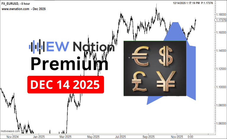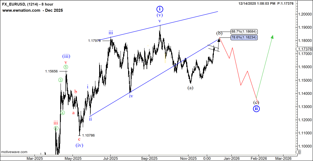 The rally from 1.0178 to 1.1919 can be seen as a complete five-wave impulse, marked 1-2-3-4-5 in wave (1), where two lower degrees of the trend are visible within wave 3, and wave 5 is an expanding ending diagonal, marked (i)-(ii)-(iii)-(iv)-(v). If this count is correct, the drop from 1.1919 must be part of a three-wave correction in wave (2), whose wave ‘b’ up is now in progress. It could reach the resistance area near 1.1850, before wave ‘c’ down towards 1.1200 can begin. In fact, if the market picks an expanding flat correction for wave (2), wave ‘b’ could even exceed 1.1919, before the bulls step aside. Only after we’ve seen a complete three-wave structure would I expect the uptrend resume in wave (3).