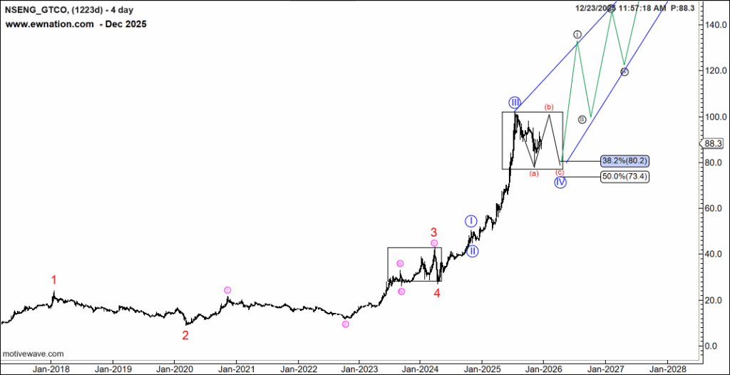 While in a sideways correction for wave 4,we anticipate the completion of wave B in three waves and wave c in five waves consistent with a potential flat correction. Target for wave 4 is 38.2 and 50% Fibonacci levels of wave 3.